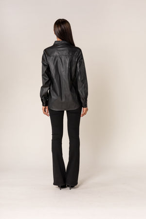 Deze dames blouse in zwarte leather look is ideaal om je look net dat tikkeltje meer karakter te geven. Perfect voor zowel een casual outfit als een avondje uit. Met haar moderne snit straalt dit dames hemd stijl, klasse én een stoere flair uit.