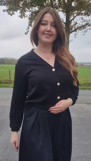 Onze buttoned trui met V-hals is het perfecte evenwicht tussen comfort en elegantie. De shiny knopen zorgen voor een subtiel glanzend accent dat de trui een chique, Italiaanse uitstraling geeft.