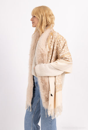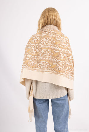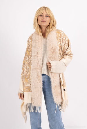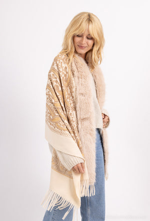 Luxe Pashmina met Wolblend en Bontdetail – Beige Paisley